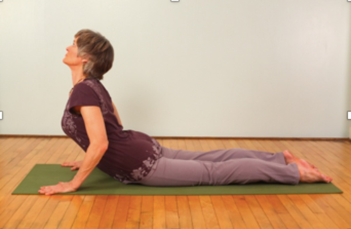 of the bottom of your shoulder blades. Hang you over the mat or blanket roll for a few minutes, relaxing and breathing. Lift that sternum and use gravity to open the heart area. It is great as passive, restorative yoga. It helps those with back issues and those who hunch in their posture. Then turn over on the mat and practice the cobra, first just barely lifting your sternum off the mat without even using your arms. Return to the mat and rest. Then do it again going higher and assisting with the arms a bit. Put more lift into it the more flexible your spine becomes. It will become flexible with repeated backbends done in a mindful and aware fashion, especially if done every day.