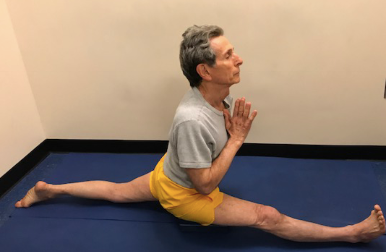 Translation: In Sanskrit, Hanumanasana means monkey pose. It is a posture in honor of the Monkey God Hanuman who is the hero in the Indian tale Ramayana. Hanuman, out of devotion and love, saved his beloved Rama’s wife Sita from a demon by effort beyond human possibility. Hanumanasana is a most intense stretch, and when you learn to do it, you will feel your super pow