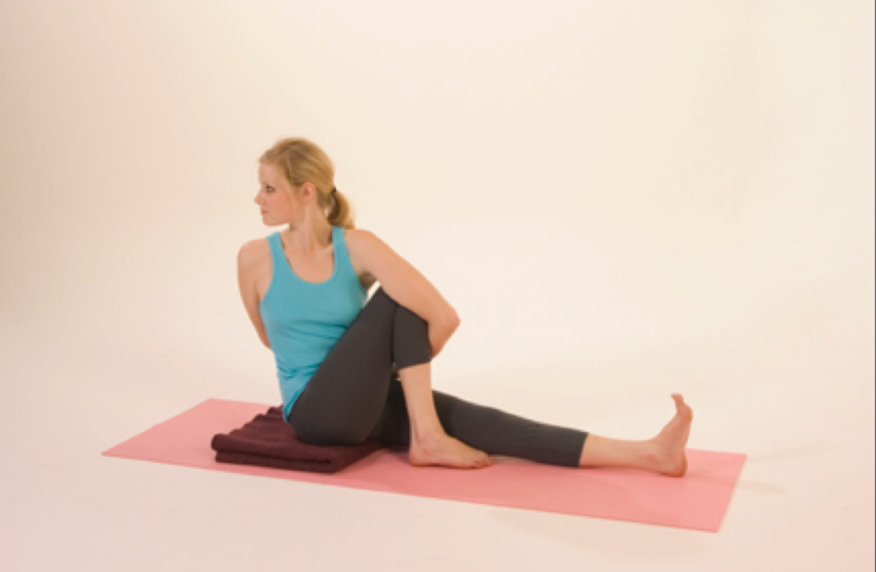 Next bend your right leg placing the right foot on the floor with the heel as close to the right buttock as possible. Your left leg is actively extended and rotates inward to a small degree. Pull your right kneecap towards your pelvis with your right upper leg’s quadriceps muscle. Sink your right thigh into the floor. Reach the right hand behind you with the fingers in contact with the floor giving you a little balance.