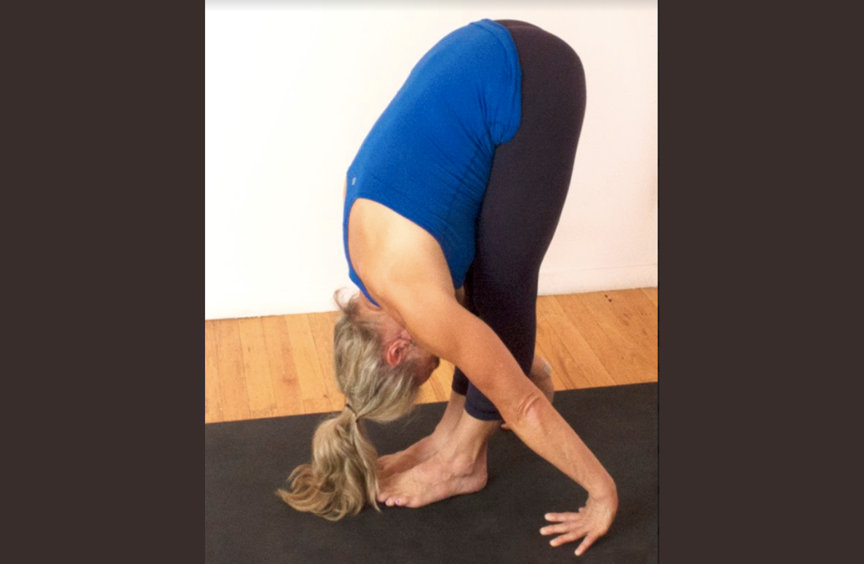 2. Another variation is to do the pose against the wall. Stand a foot to a foot and half away from the wall, facing away from it. Bend forward and send your hips back to the wall. As you do the pose, your legs will be at an angle from the floor to the wall. Your sit bones should touch the wall, not your hips. Extend the spine and reach for the floor. Now try standing on your tiptoes. It should raise your sit bones on the wall. Leave your sit bones at the spot on the wall and come down onto your flat feet. As you do this, you will notice that your pelvis rotates and thus allows your spine to extend. The action of the raising of the sit bones and the pelvis is good to help your body understand when you do the pose in this variation or the other way.